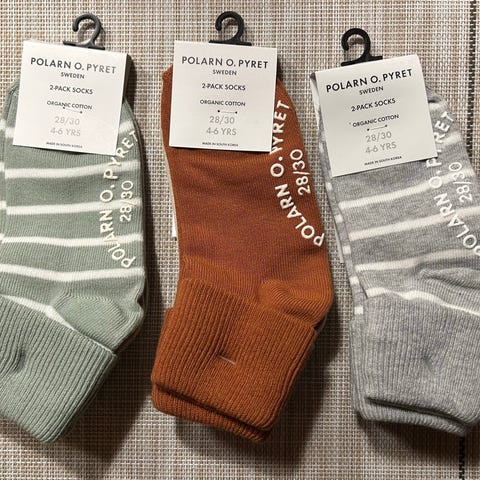 Polarn o pyret jarrusukat. Uutena ostettu ja yhden pojan pitämät. Näitä on toisetkin parit, mutta toistaiseksi nämä löytyi ensialkuun myyntiin. Muuten siistit käytetyt sukat, mutta toisessa beigessä sukkaparissa varressa pieni kuluma (kuva). Yhdessä yhteishinta.