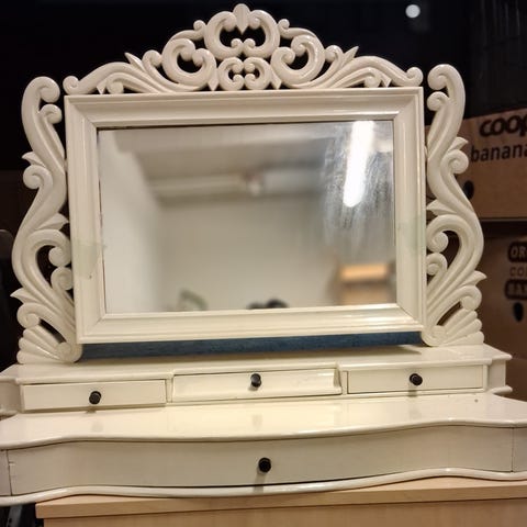 80x55cm piian peili, tukevaa tekoa, pinta erinomaisessa kunnossa, toinen tukijalka irronnut takaa. Sen voi kiinnittää paikoilleen, mutta pysyy myös yhden jalan varassa pystyssä. Sopii niin pöydälle kuin seinällekin.