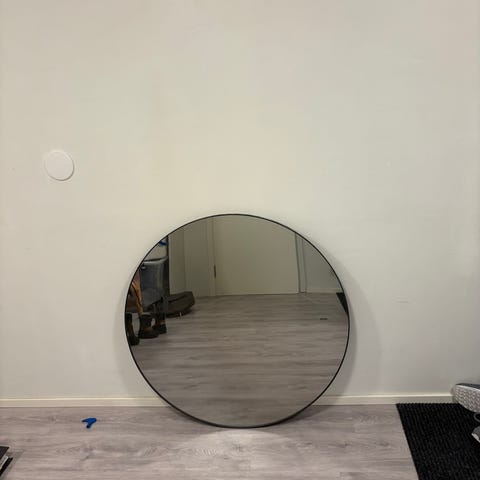 Ferm Living pyöreä peili, jossa on nahkainen kiinnityslenkki.