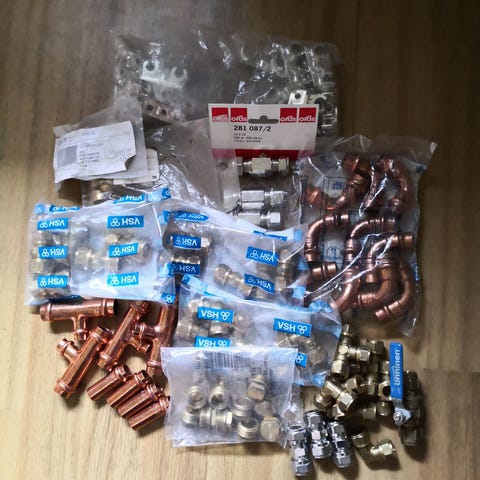 LVI-tarvikkeita puserrusliittimiä,kuulasulkuja,kytkentäletkuja,imusuojia ym.