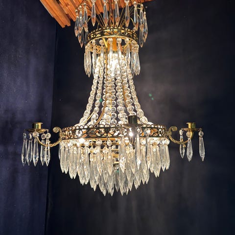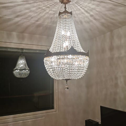 Kattokruunu on hieman pölyinen mutta yhtään kristallikoristetta ei puutu. Alimmaisena koristeena oleva kristallipallo on lisätty eikä siis kuulu alkuperäiseen valaisimeen. Sisältyy