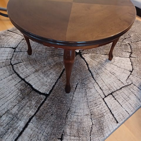 Pyöreä koivuinen vanha pöytä salmiakkikuviolla. Kuvio on maalattu ja päällä lakka, joten kestää pyyhkimistä. Halkaisija 62 cm ja korkeus 58 cm. Pöytä on tukeva ja siisti.
