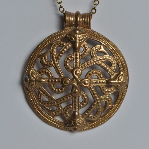 Koristeellinen pronssinen riipus Kalevala-tyylisessä muotoilussa. Veistoksellinen, orgaaninen pinta ja lämmin pronssinsävy antavat korulle voimakkaan ja ajattoman ilmeen. Riippuva pyöreä yksityiskohta tuo koruun liikettä ja viimeisteltyä ilmettä.