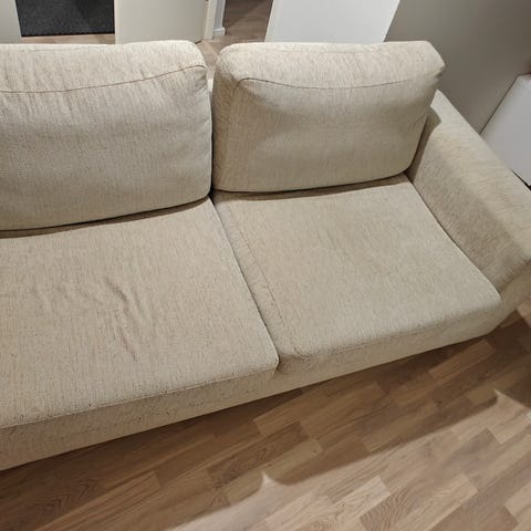 Vanha keltainen sohva myynnissä. Yksi reikä mistä kuva, muuten näkyy että on jo ikää.