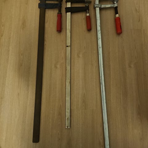 Kolme järeää puristinta. Painot n.6 kg, vähän yli kolme kiloa ja vähän alle kolme kiloa. Hinta yhteensä 200 €.
