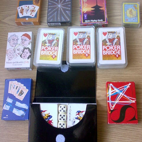Korttipakka on sinivalkoinen ja sisältää klassiset pelikorttien kuvat kuten kuninkaan ja jokerin.