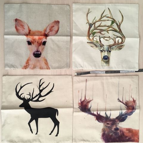 Kaksi hirviaiheista tyynyä. Hirven saa tarralla olemaan "seisoma-asennossa" ja tarran avaamalla tyynymuodossa.