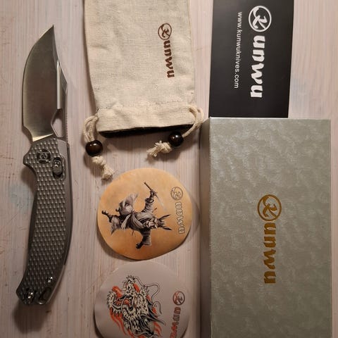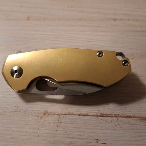 Kizer Feist frontflipper titaanikahvoilla ja kivipestyllä s35vn terällä. Kahvoissa nähtävissä oikeassa valossa muutama pieni naarmu ja ns "snail trail" jälkiä kun on pyörinyt pöydällä.