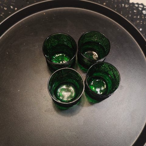 Alkuperäisessä pakkauksessa 6kpl vihreitä snapsilaseja. Täysin ehjät ja tarrat paikoillaan. Pakkaan huolellisesti postitusta varten.