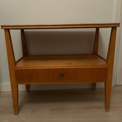 Puinen puhelinpöytä, jossa on verhoiltu istuin ja säilytystila. Istuinverhoilu on kukkakuvioinen kangas. Sopii esimerkiksi eteiseen tai muuhun tilaan, jossa tarvitaan istumapaikka ja säilytystilaa.