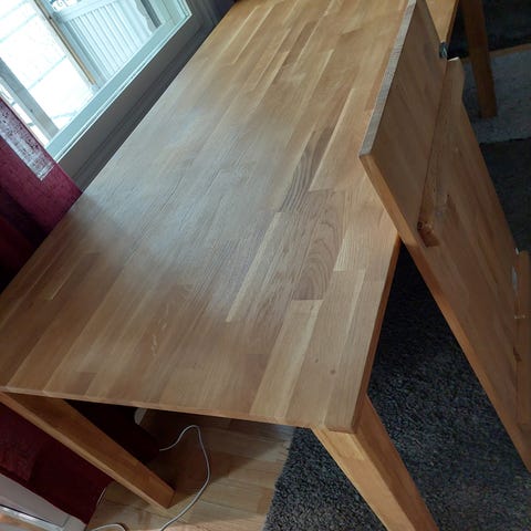 Myydään muuton tieltä kaksi vuotta vanha ruokapöytä. 90x200 luonnonvärinen tammi/musta. Ovh. 499€