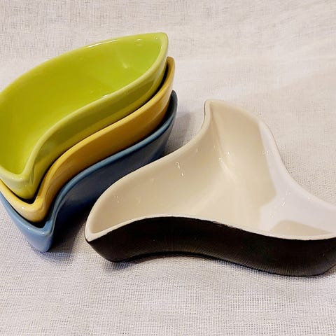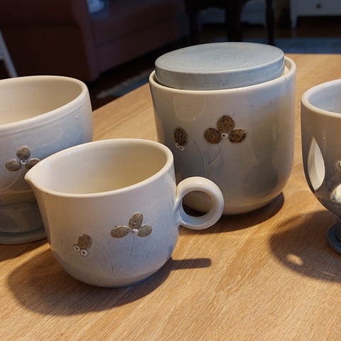 Suomalaista keramiikkaa, Jussis keramik, lautanen ja neljä pientä kuppia esimerkiksi mausteille. Kaunis ja ehjä.