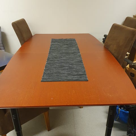 Viilupöytä, jonka pinta paikoin kulunut. Pöydän pinnoite on myös kulunut joten pöydässä on pinttyneitä tahroja.