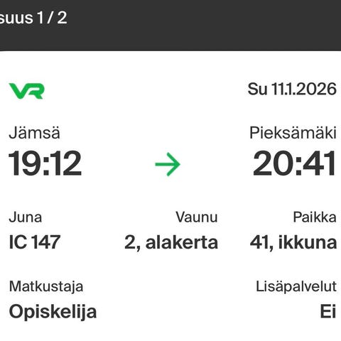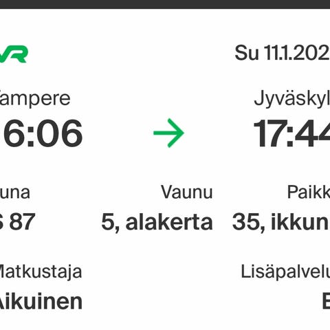 Tampere-Jyväskylä 11.1.26. Huom. eläkeläisen liput!