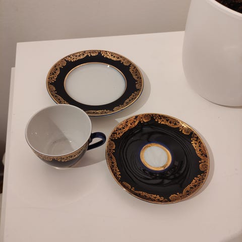 Kaupan päälle saman värinen Arabian kakkulautanen, sekä 6kpl samaan tyyliin sopivia USSR Riga kakkulautasia (ei siis Arabiaa)
