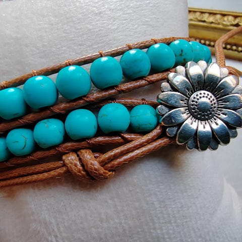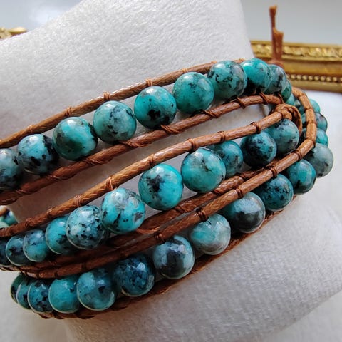 Kaunis kiedottava rannekoru aidoista amatsoniitti- ja howliitti-kivihelmistä.
