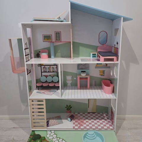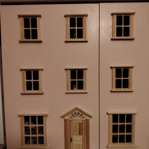 Suomen minimaailman aikuisten nukkekoti Vallila. Ostettu uutena ja itse kasattu, sekä tapetoitu. Portaat maalattu. Verhot tehty joka ikkunaan. Talo ollut koristeena, ei leikitty.