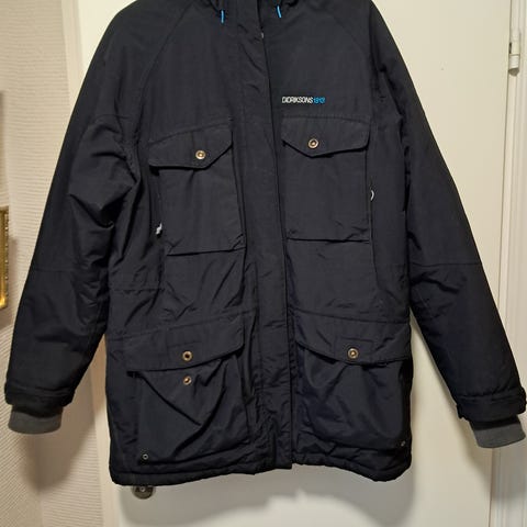 Didriksons musta talvitakki koko 42. Vedenpitävä lämmin takki. Vyötäröllä kiristysmahdollisuus takin sisällä. Erittäin siisti. Suurimmat moitteet vetoketjun vetimen kuluminen, kts kuva sekä yhden napin päällikankaassa oleva kuluma, kts kuva (vääristää takin väriä haaleammaksi kuin on). Mielestäni muuten tasaisen musta. Heijastinhuppu ja korkea kaulus.