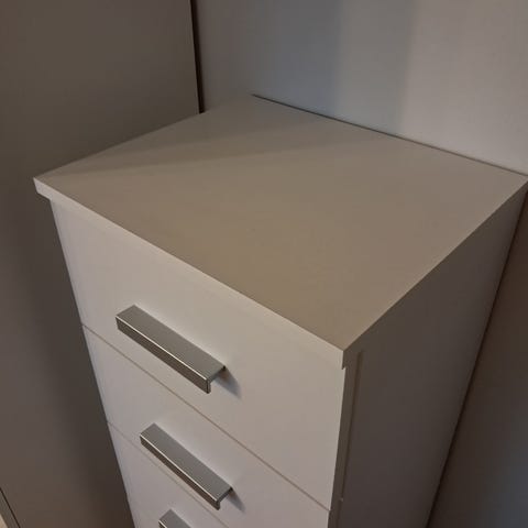 Harmaa-valkoinen hyväkuntoinen lipasto. Ei isompia käytön jälkiä. Savuton & eläimetön talous