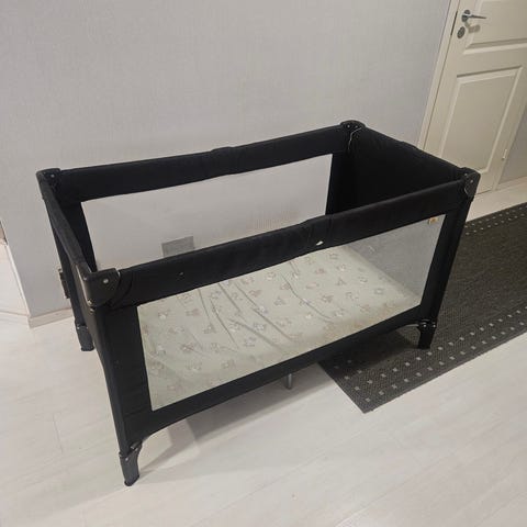 Matkasänky säilytyspussilla. Sängyn koko n.60x120cm