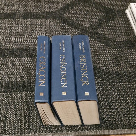 Christopher Paolinin Perillinen-sarjan kolme ensimmäistä kirjaa, Eragon, Esikoinen ja Brisingr. Hyväkuntoisia, kovakantisia kirjoja.