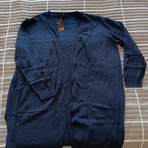 Esmara tummanharmaa napitettava neuletakki. Koko 40/42, kainalo-kainalo 49 cm ja pituus 65 cm. Materiaali viskoosia ja polyamidia. Kangas joustaa jonkin verran.