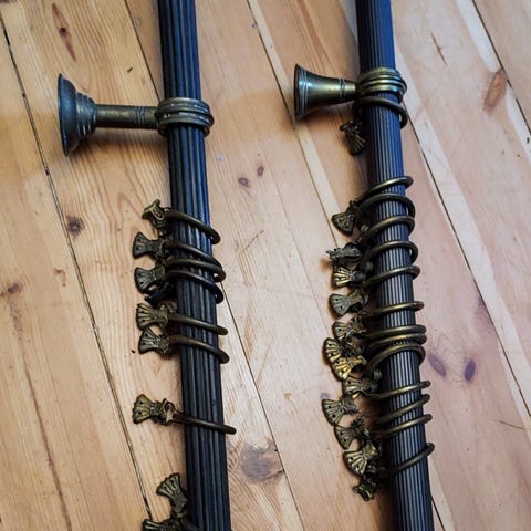 Myydään kuvan 5kpl vanhat verhotangot. Vanhimmat ovat käsittääkseni 60-luvulta, voidaan käyttää myös seinävaate tanko / pienen ikkunan verhotanko -käytössä. Isoin tangoista voidaan pidentää melko pitkäksi, joten sopii suurempaankin ikkunaan. pelti antiikki antiikkinen ryijyn seinä vaate kulta metallinen vintage retro 60-luvun ryijytanko verhotangot
