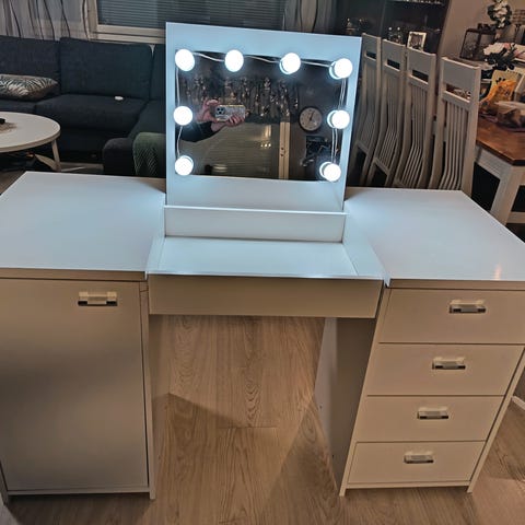 Todella hyväkuntoinen kirjoituspöytä. Pyökin värinen. Ei naarmuja. 4 laatikkoa. Kaapissa yksi hylly. Vain nouto Hyvinkäältä.