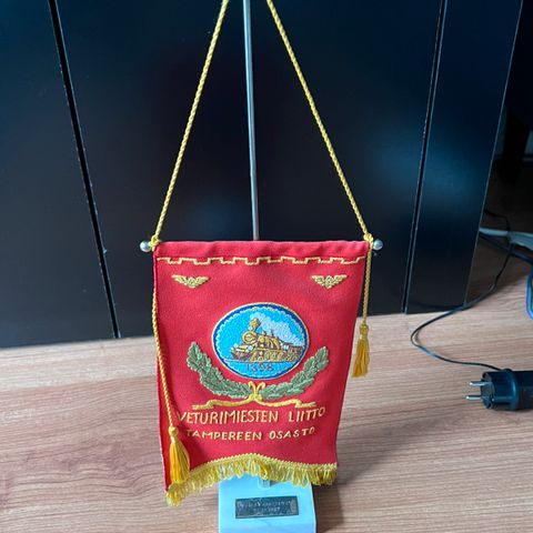 Myydään upeannäköinen vanha VR Veturimiesten Liitto Tampereen Osasto pöytästandaari, ja marmorinen jalustatanko, viirin korkeus noin 46cm. Valmistettu 70-luvun lopulla. Itse viiriosa on selvästi keskimääräistä laadukkaampi, paksumpaa kangasta, kuvat ommeltu erikseen viiriin ja kultaiset hapsut ja solmukkeet. Viirin on valmistanut tamperelainen Taitopaino . Hieno ja korkealuokkaisesti tehty kokonaisuus VR-keräilijälle! logo pöytä pöytäviiri lipputanko lippu tanko standaari pöytästandaari viirejä viiri pienoislippu pienois yhtiö suomi suomalainen kotimainen valtion rautatie punainen 1898 veturimies veturinkuljettaja juna höyryveturi taito paino suomi finland veturiliitto rautatieliitto valtio