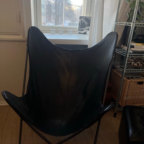 Nahkainen lepakkotuoli. Hyvässä kunnossa. Joitain käytönjälkiä mutta yleisilme on hyvä.