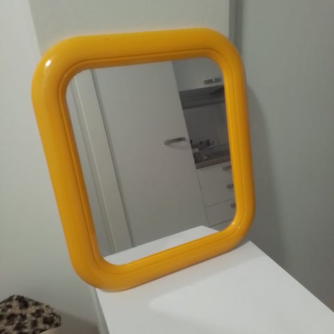 Valkoista muovia, jalusta hieman eri väriä, Peili 27×31 cm