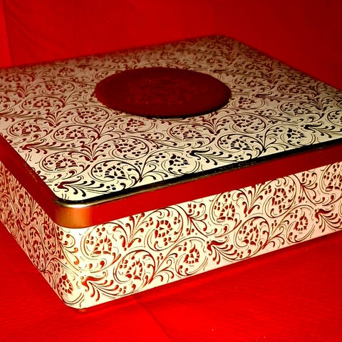 Mitat noin 5X30x20 cm, kansi kiinni saranoilla. Pohjassa merkintä HELLAS N:o 0534 Perheidylli Suklaakonvehteja- Praliner 640 g. Suklaatehdas, Turku, Finland