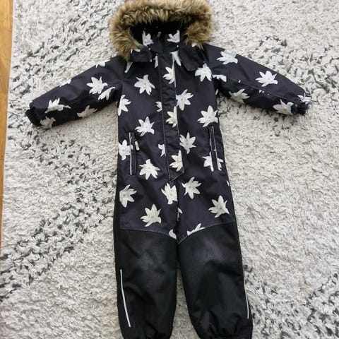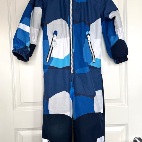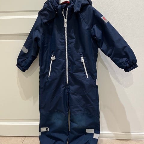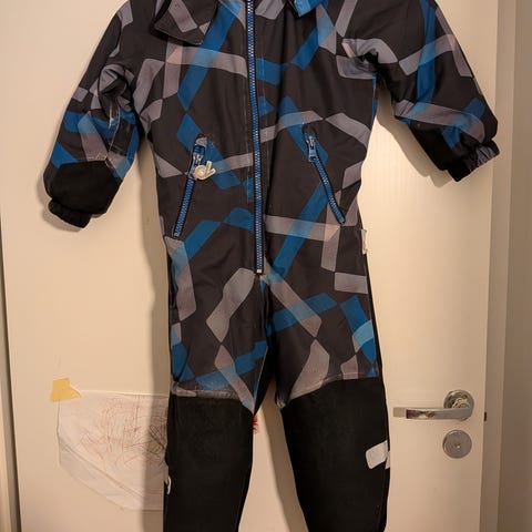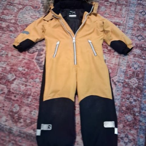 Reimatec toppahaalari 110. Polvissa ja pepussa kulumaa ja toisesta lahkeesta paikattu pieni reikä. Paikkaus kestänyt hyvin käytössä. Hyvä rymyhaalari vielä. Varmaan vähän ohentunut, mutta ihan talvihaalari vielä.