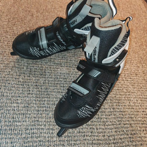 Tempish lasten ensiluistimet, joissa on säädettävät metalliset terät ja punaiset hihnat. Kiinnitys kenkään.