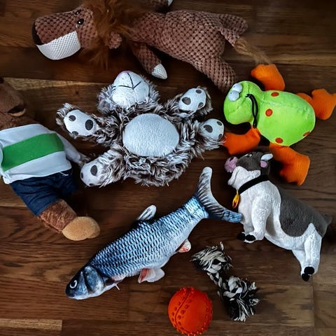Setti sisältää koiran hoitovälineitä ja lelun. Feel active panta 25-35 cm, punainen panta 29 cm. Kynsisakset , harja ja kampa ( puremajälkiä) ja lelu.
