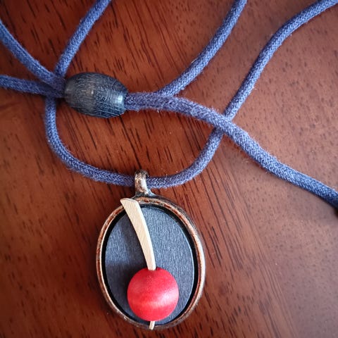 Aarikka riipus jossa punertavan ruskeat puupallot.