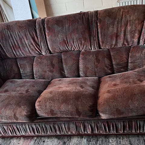 Annetaan pois sohva projektiksi uudelleen verhoiltavaksi. Annetaan, koska kissa otti sohvan pissapaikakseen, enkä saa millään hajua pois millään, että lopettaisi. Jouduin myös jo heittämään yhden istuintyynyistä pois. Mukana tulee siis kaksi istuintyynyä ja 3 tyynynpäällistä.