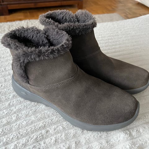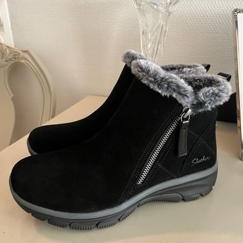 Skechers talvikengät, koko 38. Sopivat myös 39 jalkaan. Leveähkö lesti. Kengät ovat mustat ja sisältävät tekoturkisvuoren. Pinta mokkanahkaa/tai sen kaltaista materiaalia.
