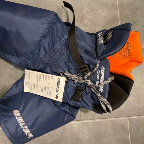 Myytävänä hyväkuntoiset siniset Bauer X60 jääkiekkohousut kokoa sr M, n. 170-180 cm pituiselle.