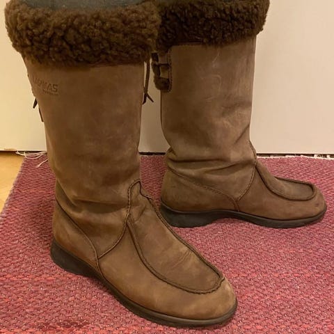 Kotimaiset karvavuoriset Lapikkaat, nahkaa. Lämpimät, rasvattu säännöllisesti, väri ruskea. Olleet käytössä noin viitenä pakkastalvena, kunnes jäivät pieniksi.