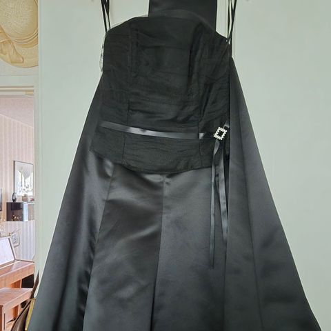 Musta ja kukallinen yo-mekko tai juhlamekko juhlavaa kangasta. Erittäin siistissä kunnossa, kerran käytetty. Koko M.