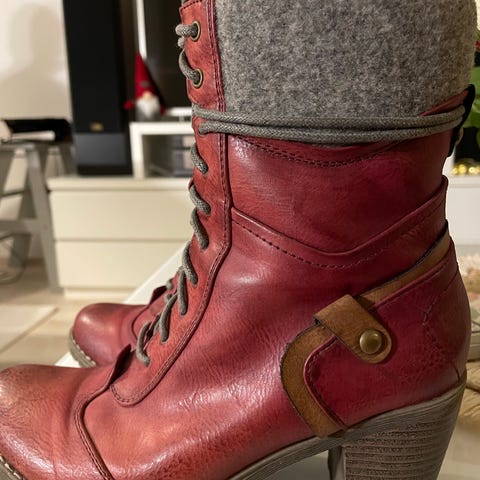 Rieker talvikengät, koko 38, ruskea väri. Vastaa kokoa, aavistuksen reilu omaan 37 jalkaan, mahtuu ohuempi villasukka. Niissä on vetoketju sivussa helpottamassa jalkaan laittamista. Koristelukot ja paksu kumipohja, joissa hyvä pito. Tukevat. Ainoa huomio on kärkiin tullut pintä osumaa. Pienellä huollolla tai suutari tekee lähes uudenveroiseksi. Katso kuvat.