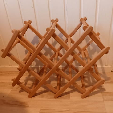 Seinälle kiinnitettävä viinipulloteline, jossa on puiset osat ja koristeellinen tausta, jossa on viinipulloja ja rypälekuvioita. Telineessä on tilaa useille viinipulloille vaakatasossa säilytettäväksi. Kuvan pullo ei kuulu kauppaan. Vain nouto