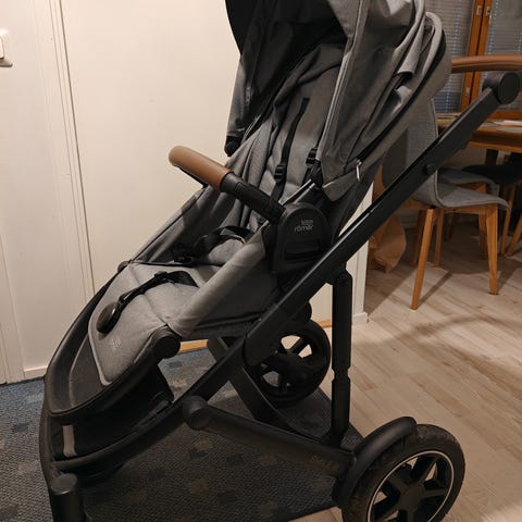 Britax Römer lastenrattaat, tummanharmaat. Rattaissa on suuri tavarakori ja säädettävä työntöaisa. Tavarakorin alakulmassa pieni reikä, ei haittaa tavaroiden säilytystä korissa.