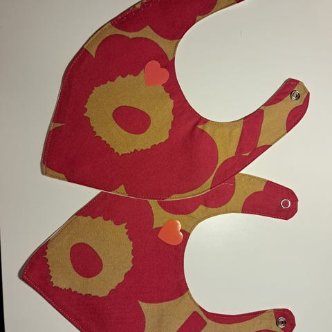3 hihallista ruokalappua. Kaupan päälle 2 tavallista. Muumiruokalapussa sinistä tussia, ks. viimeinen kuva.
