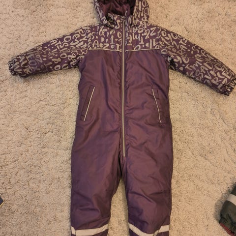 Hyväkuntoinen toppapuku 110 cm. Pepussa ja polvissa näkyy vähän pehmentymää, mutta hyvät vahvikekankaat tässä. Takaa heijastimet hiukan kärsineet.