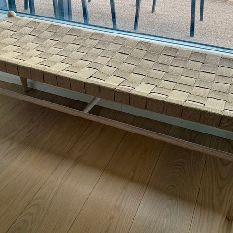 Selkeälinjainen KÖPENHAMN-sohvapenkki, ns. Daybed, jossa punotut nauhakudokset ja ylellinen lieriömallinen nahkatyyny. Nauhakudokset punottua juuttia ja tyylikäs runko tammea.