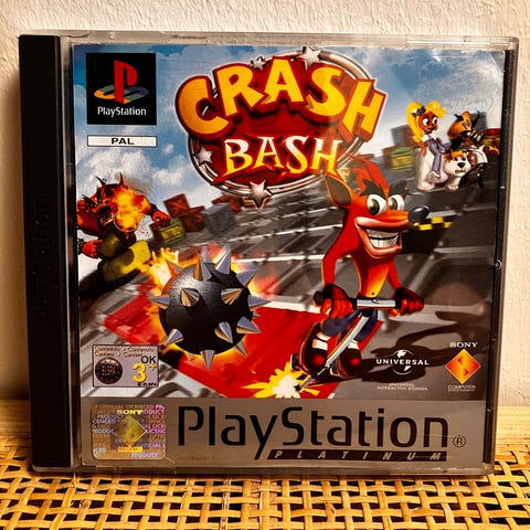 Vanha kunnon Crash Bash Playstationille. CIB, eli löytyy itse peli, kannet, kansilehti ja ohjekirja.