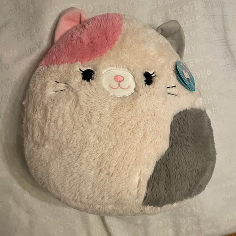 Squishmallows pehmolelu, jossa on sinivalkoinen ja vaaleanpunainen väri. Pehmeä materiaali ja pyöreä muotoilu. Sopii lasten leikkeihin ja keräilyyn.