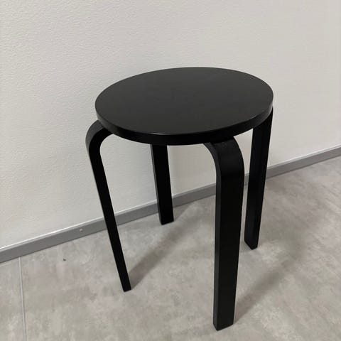 Kunto:hyvä, jakkara on tukeva ja rakenteellisesti ehjä ja karva on pehmeää ja hyvässä kunnossa. Jakkaran jaloissa on käytönjälkeä maalipinnassa ja kulumaa.
